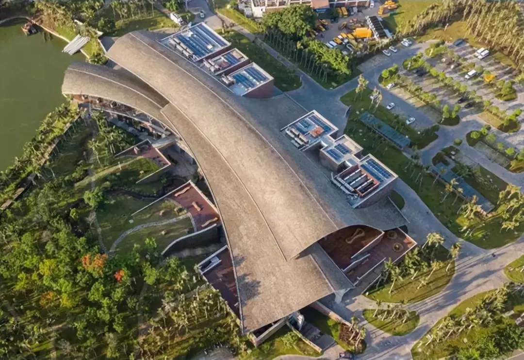 工程以单曲面木质屋盖作为建筑外立面最重要的展示部分,屋面主要材料为奥地利的云杉双拼弧形胶合梁和加拿大的红雪松木瓦片,一共有68根拼接弧梁,最长跨度达58.8米,整个屋面使用了35万片特制加厚红雪松木瓦以及140万根钢钉。三片屋面面积为9000平方米,是全亚洲面积最大的纯木结构屋面。项目技术成果《沿海地区大跨度双曲面木屋盖关键技术研究与应用》,经鉴定达到国际先进水平。远观三片芭蕉叶形状的曲面木质屋盖飞檐起翘,如波浪起伏,让人赏心悦目。外立面采用海口本地的火山石(玄武岩),该材质抗风化、耐气候、经久耐用,其独特的“呼吸”功能能够调节空气湿度,改善生态环境。